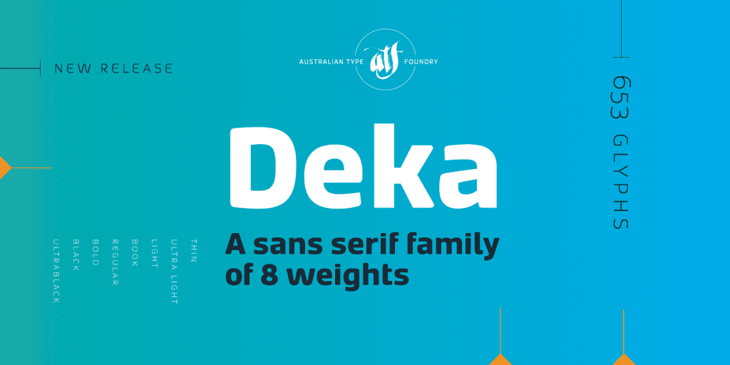 Deka is a minimal sans-serif family of eight weights, designed for both text and display use. A full international character set including all latin-based European languages and Cyrillic makes the font very versatile, while features such as non-lining numerals and true-drawn small caps make Deka a worthy choice for long document use.