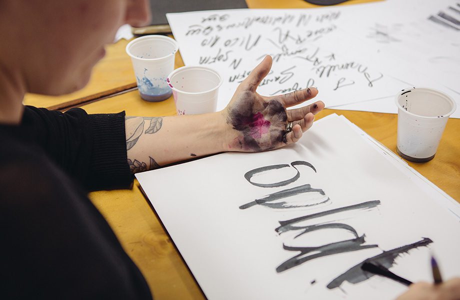 - Participants introduce a style to their phrase using brushpen on tracing paper